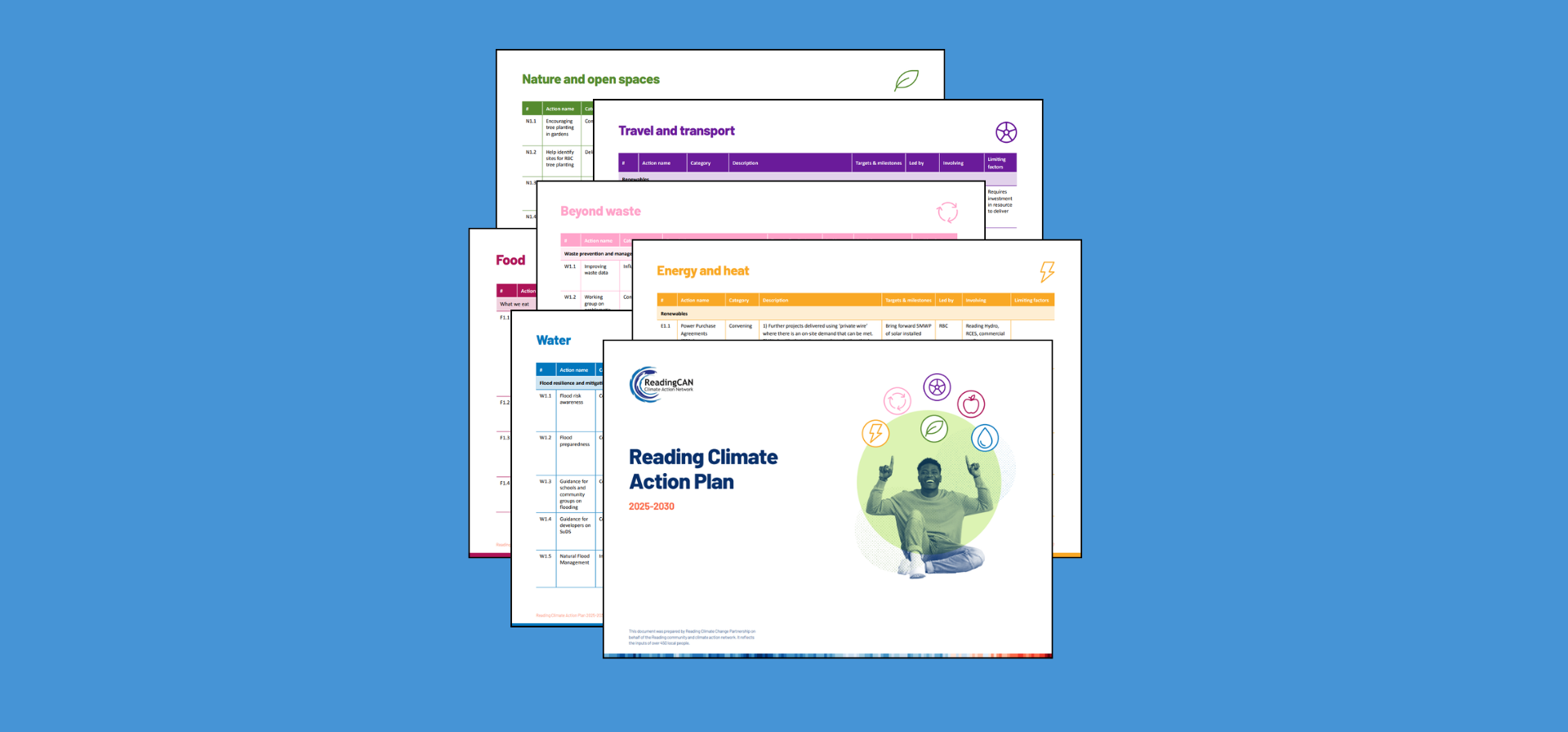 The Reading Climate Action Plan sets out actions local organisations have pledged to take over the next five years. It is not a 'guide to action' for individuals in their personal lives. Several actions will *enable* climate action by individuals, e.g. tariff trials; climate-friendly menus; funding bids; tailored resources and services; and/or campaigns that help large groups of people to act together for collective impacts.
