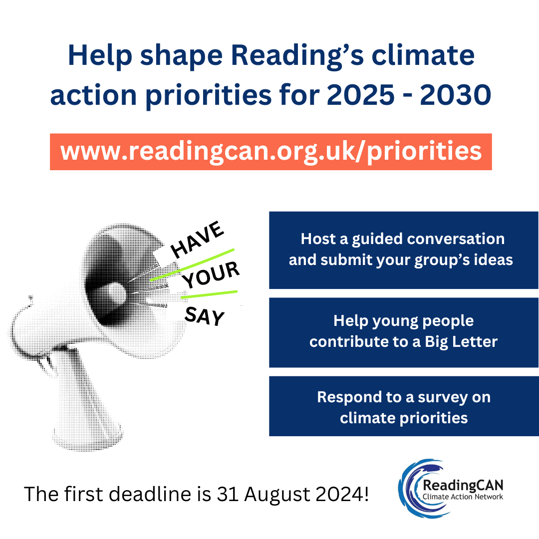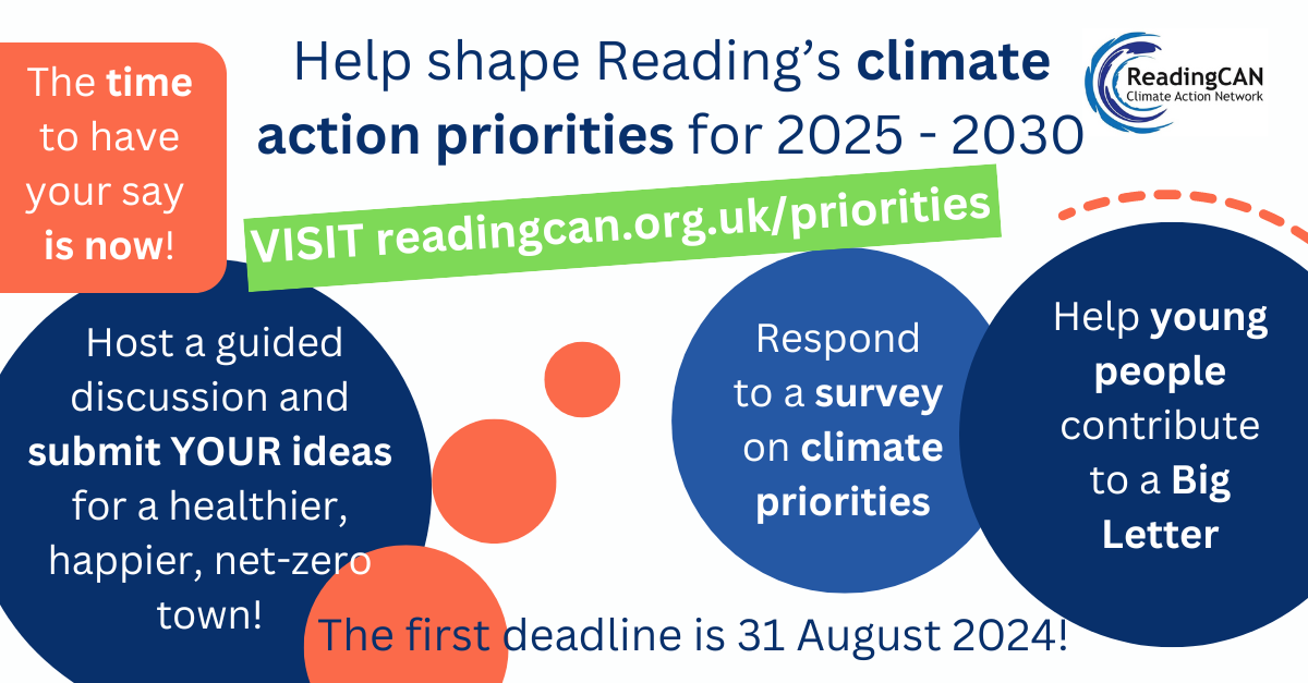 JUST LAUNCHED! Respond to a survey on Reading’s climate action priorities. The survey reflects the very early discussions of the Designing a Net Zero Reading deliberative group and your survey responses will help shape the next stages of this discussion. Deadline: Noon on 5 September 2024. Survey link: https://www.surveymonkey.com/r/3WG8MWL More info: www.readingcan.org.uk/priorities